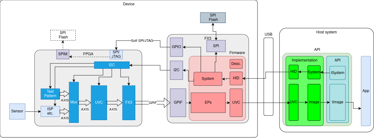 Custom HID Interface: The FX3 firmware includes a HID interface for accessing I2C, FPGA registers, and external devices directly from the host computer.